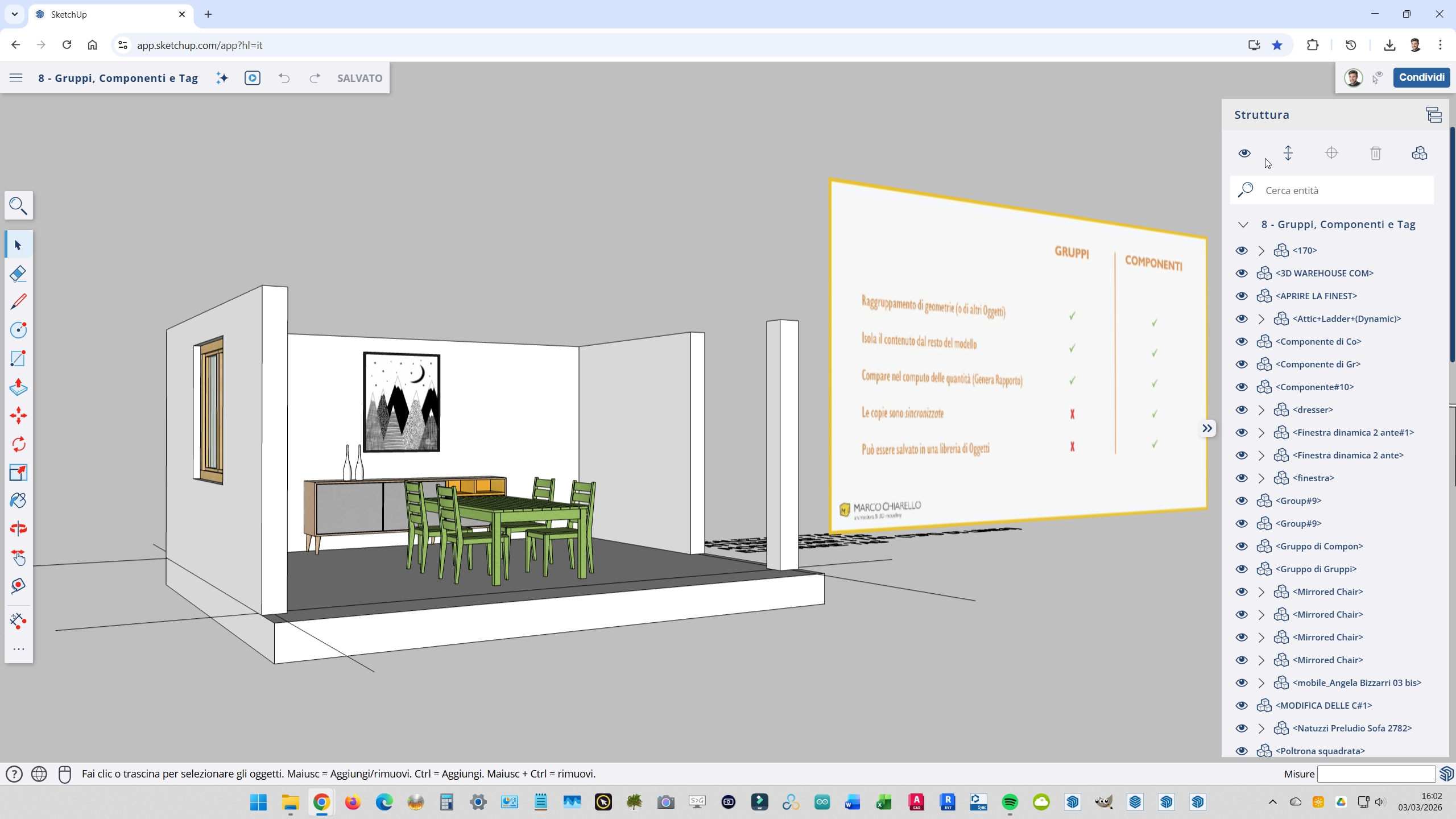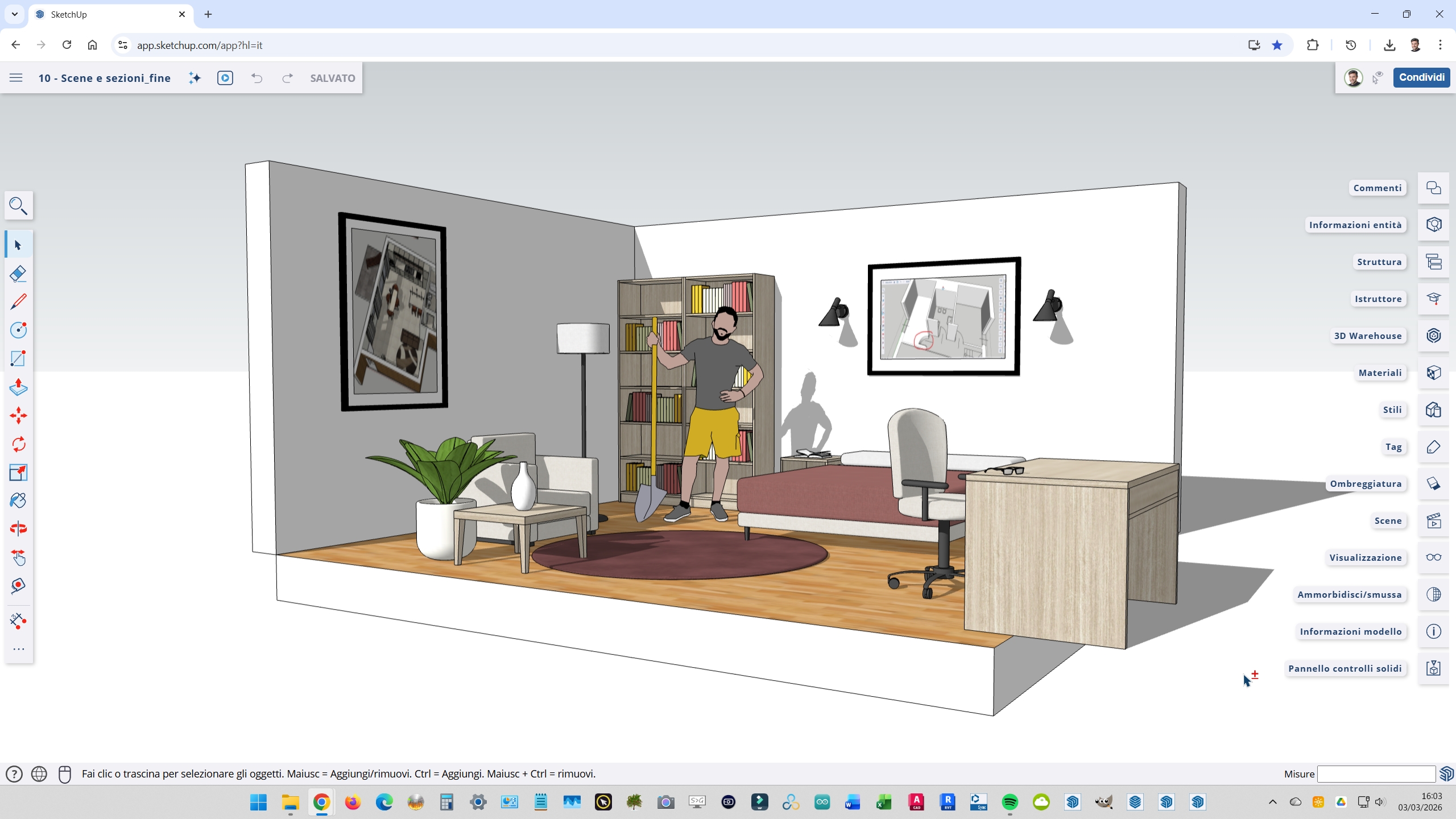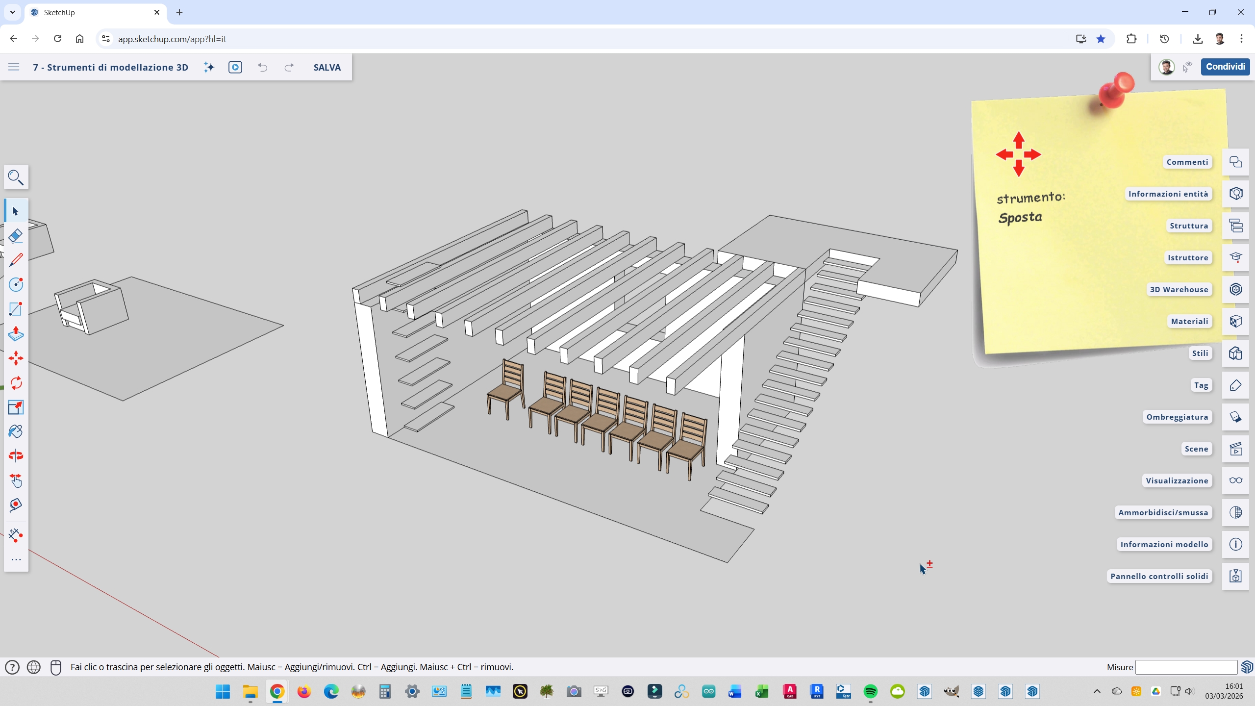 Usa gratuitamente il software e impara a modellazione quello che vuoi. Il corso è una guida alle versioni ONLINE di SketchUp: dalle basi alla stampa in scala, modellazione 3D, Ai rendering, materiali personalizzati e 6 esercizi pratici.